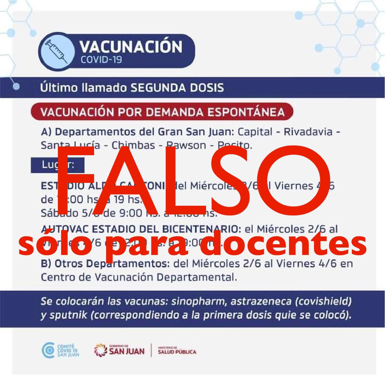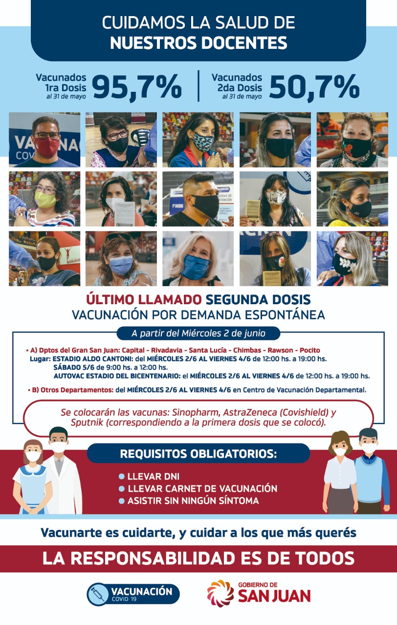 El Gobierno provincial, a través del Ministerio de Salud Púbica, con el objetivo de continuar avanzando con el Plan Provincial de Vacunación y de cuidar la salud de los docentes de la provincia, solicita a los docentes que ya recibieron la primera dosis de Sinopharm, AstraZeneca (Covishield) o Sputnik V, a asistir a los lugares correspondientes para recibir la segunda dosis de la vacuna.