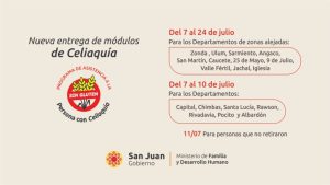 El Ministerio de Familia y Desarrollo Humano informa el cronograma de entrega de módulos alimentarios para personas celíacas, correspondientes al mes de julio. Esta acción se enmarca en el programa de Asistencia Nutricional que busca garantizar el acceso a alimentos libres de gluten, en cumplimiento con las políticas públicas orientadas a la inclusión y el cuidado de la salud.
