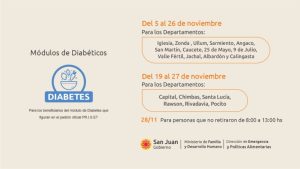 La Dirección de Emergencia y Políticas Alimentarias, dependiente del Ministerio de Familia y Desarrollo Humano, informa que durante el mes de noviembre se llevará a cabo una nueva entrega de módulos alimentarios para personas con diabetes, en el marco de las políticas públicas destinadas a promover una alimentación saludable y adecuada para quienes conviven con enfermedades crónicas.