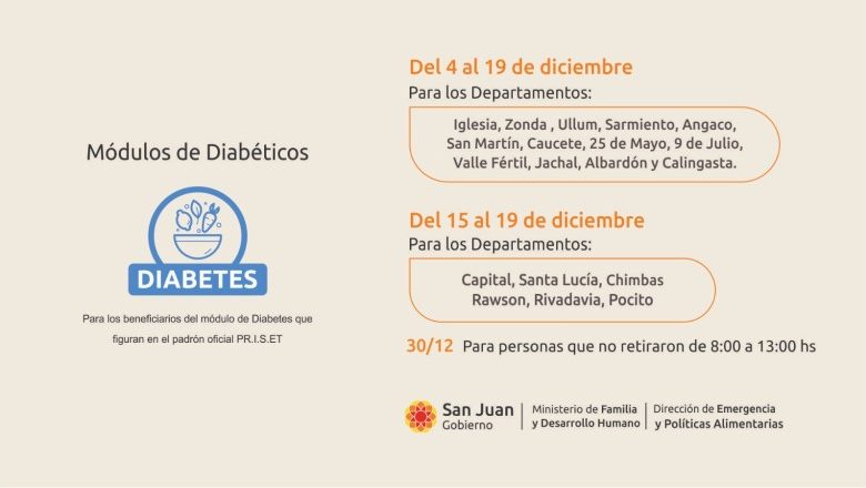 La Dirección de Emergencia y Políticas Alimentarias, dependiente del Ministerio de Familia y Desarrollo Humano, informa que continúa desarrollándose una nueva etapa de distribución de módulos alimentarios destinados a personas diagnosticadas con diabetes.