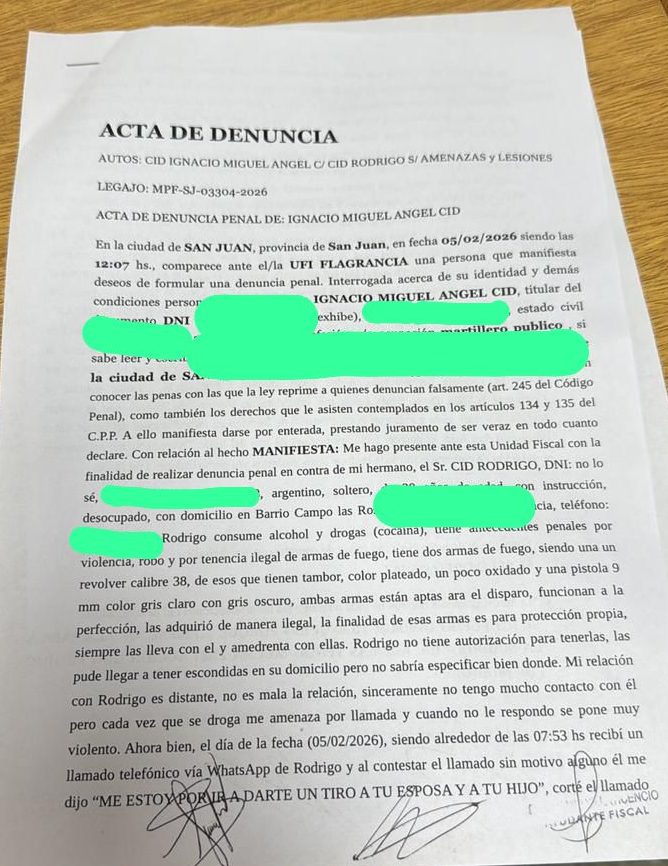 Tras esas presentaciones formales, la UFI Genérica a cargo del Fiscal Ignacio Achem junto a una brigada especial de investigaciones, llegó hasta el domicilio de Rodrigo Cid. En la denuncia su hermano dejó saber que su hermano «tiene dos armas de fuego, una pistola 9mm y un revolver calibre 38» aclarando en la denuncia que «siempre las lleva con él, las adquirió de manera ilegal y las usa para amedrentar».