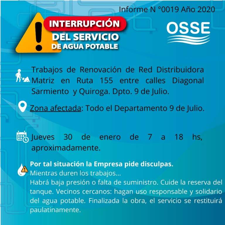 Usuarios de la red de agua potable del departamento 9 de Julio verán interrumpido el servicio esencial. Será desde mañana jueves a las 7 horas por un trabajo de renovación que realizará OSSE en la red distribuidora matriz ubicada en Ruta 155 entre Diagonal Sarmiento y Quiroga.
