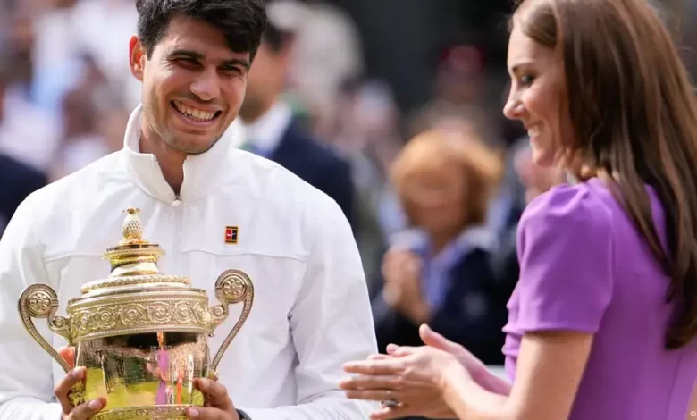Alcaraz recibió el trofeo de manos de la princesa Catalina de Gales, que asistió a la final, en su segunda aparición pública desde que le fuera diagnosticado en marzo un cáncer, del que se desconocen detalles.