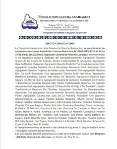 La comisión interventora de la Federación Gaucha Sanjuanina informa e invita a los socios a participar del Re empadronamiento. El mismo se realizará dese el día jueves 31 de julio hasta el 4 de agosto inclusive del corriente año.