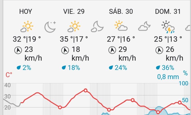 Con 32° de máxima y 34° para mañana, las jornadas calurosas darán un respiro a los sanjuaninos. Con la llegada de un frente de vientos del sector sur cuya velocidad rondará los 30Km/h, las temperaturas bajarán sensiblemente sin llegar a los 28° para sábado y domingo con una mayor nubosidad y posibilidades de algunas lluvias leves para la madrugada del sábado y primeras horas del domingo. Fin de semana ideal para actividades al aire libre y disfrutar de los paisajes cordilleranos junto a la buena gastronomía sanjuanina.