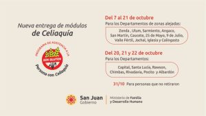 El Ministerio de Familia y Desarrollo Humano informa, durante el mes de octubre se llevará a cabo la distribución de módulos alimentarios destinados a personas celíacas, en el marco del programa de asistencia nutricional que tiene como objetivo garantizar el acceso equitativo a alimentos libres de gluten. Esta iniciativa se desarrolla como parte de las políticas públicas de inclusión social y promoción de la salud.