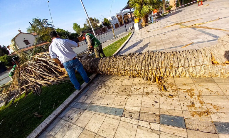 Una palmera de gran altura que se tambaleaba en el shopping de calle Del Bono debió ser erradicada a pedido de los gerentes del centro comercial por lo que se apersonaron operarios capitalinos junto a Bomberos para remover el ejemplar que amenazaba con caer.