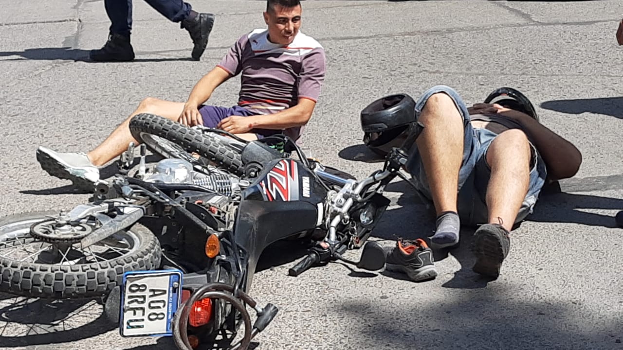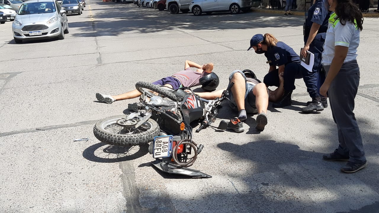 El conductor de una moto 150 cc y su acompañante chocaron violentamente contra un Peugeot 208 en la esquina de avenida Ignacio de la Roza y Entre Ríos, Capital.