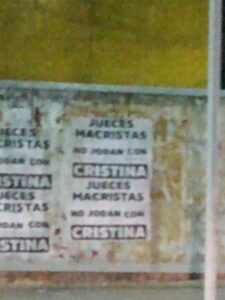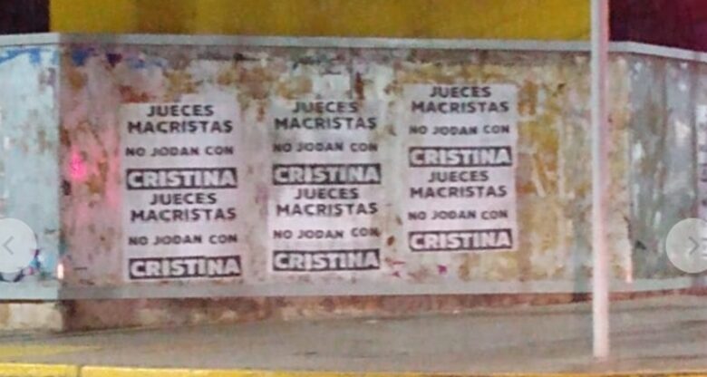En la mañana de hoy distintas esquinas de San Juan amanecieron con carteles y pegatinas referidas a la causa contra Cristina. Puntualmente en la esquina de Santa Fe y Gral. Acha se encuentra esta serie de carteles con el mensaje “JUECES MACRISTAS, NO JODAN CON CRISTINA”.