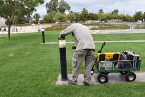 La Subdirección de Espacios Verdes comenzó con las mejoras en la fuente y los jardines de la plaza del Teatro del Bicentenario. Se realizó el vallado de la fuente, para brindar seguridad y durante este fin de semana se procederá al vaciado de la misma. Una vez que esté sin agua, se procederá a la limpieza, del suelo utilizando productos químicos especializados, pues esta fuente hace tiempo que no pasa por una limpieza exhaustiva. Estos productos servirán para remover todo el material acumulado.