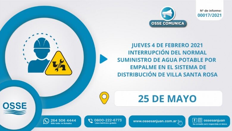 OSSE comunica que el día jueves 4 de febrero, entre las 8 y las 17, el servicio de agua potable se verá interrumpido en zona de Villa Santa Rosa, departamento 25 de Mayo.