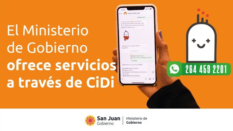 CiDi consiste en un chat con el que se puede interactuar agendando el número 2644592201, a través de la aplicación WhatsApp; funciona las 24 horas del día y está pensada para dar solución y acceso a documentos e información.