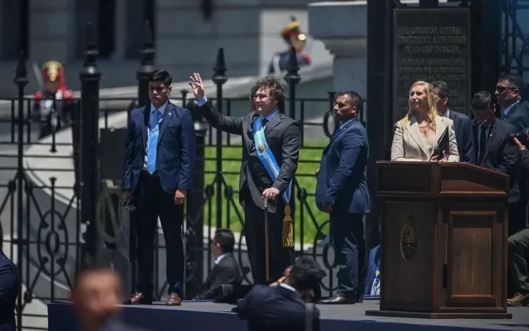 «Hoy comienza una nueva era en la Argentina» y «damos por terminada una larga y triste historia de decadencia y declive, y comenzamos el camino de reconstrucción de nuestro país» desde las escalinatas del Congreso nacional, acompañado por la vicepresidenta Victoria Villarruel, sus funcionarios designados e integrantes de las delegaciones extranjeras, entre ellos el presidente de Ucrania, Volodimir Zelenski.