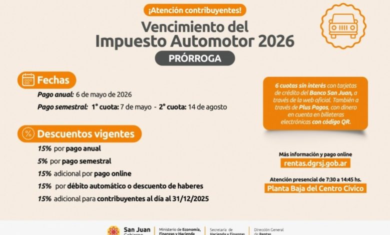 Además, los contribuyentes podrán abonar el impuesto anual y semestral en hasta 6 cuotas sin interés con tarjetas del Banco San Juan, facilitando el cumplimiento de la obligación tributaria.