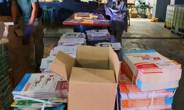 El miércoles de la semana pasada llegaron a la provincia los cuadernillos enviados por Nación. Tras la desinfección del cargamento las directoras de Nivel y personal mínimo afectado, siguiendo el protocolo sanitario trabajaron el fin de semana largo, clasificando y dividiendo por Nivel Inicial, Primario y Secundario, los cuadernillos nacionales a los que se les adjuntaron las guías locales ,y un instructivo sobre las medidas de prevención sanitaria contra el COVID-19.