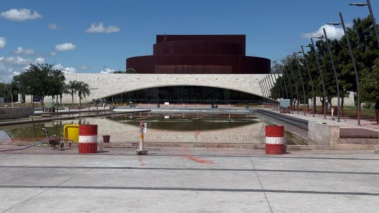 La Dirección de Espacios Verdes realiza el mantenimiento programado de la fuente y reutiliza el agua extraída para el riego de sectores cercanos al Teatro del Bicentenario.