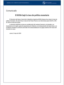 El Banco Central de la República Argentina (BCRA) volvió a bajar la tasa de interés y la llevó al 50% anual – 4,2% mensual – al considerar un rápido ajuste de expectativas de inflación, entre otros indicios económicos. La medida fue comunicada este jueves y es la segunda semana consecutiva que la entidad bancaria anuncia una baja en la tasa de política monetaria.
