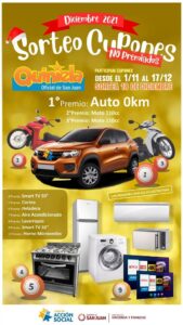 Como cada año, la CAS realiza a fin de año un sorteo de cupones no premiados con grandes premios. Para esta edición el 1º premio será un automóvil OKm, 2º y 3º premio serán motos de 110 cm3 respectivamente; el 4º un Smart TV de 50 pulgadas; el 5º una cocina de seis hornallas; el 6º una heladera; el 7º, un aire acondicionado split; el 8º un lavarropas; el 9º un Smart TV de 32” y el 10º un horno microondas.