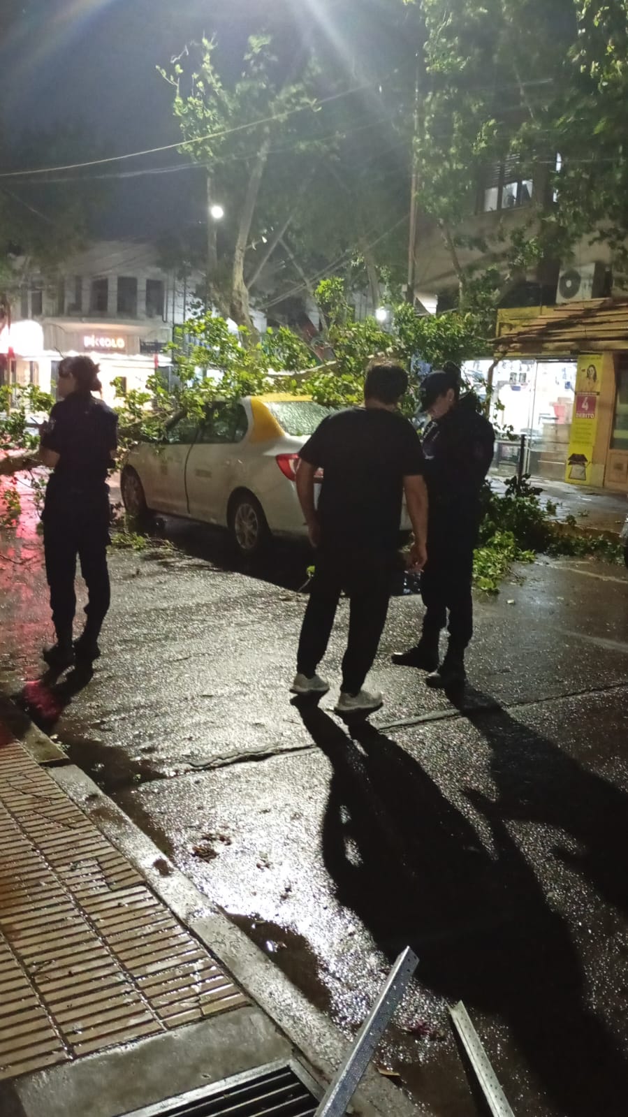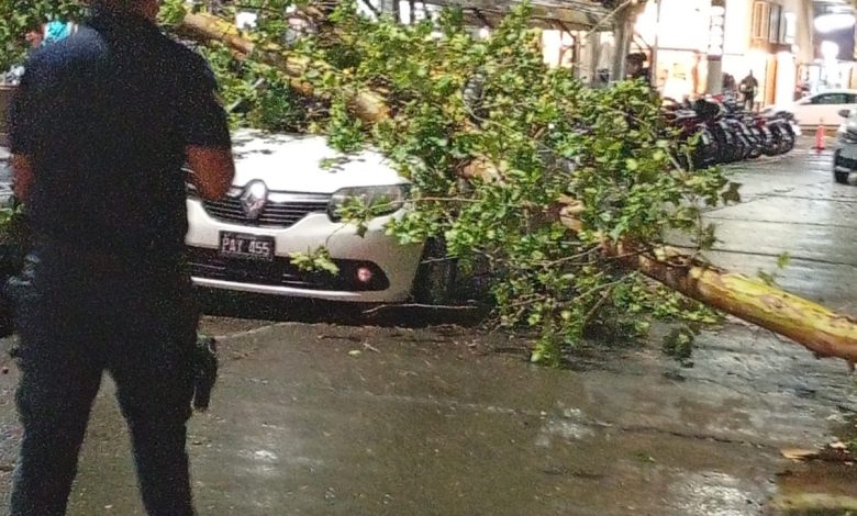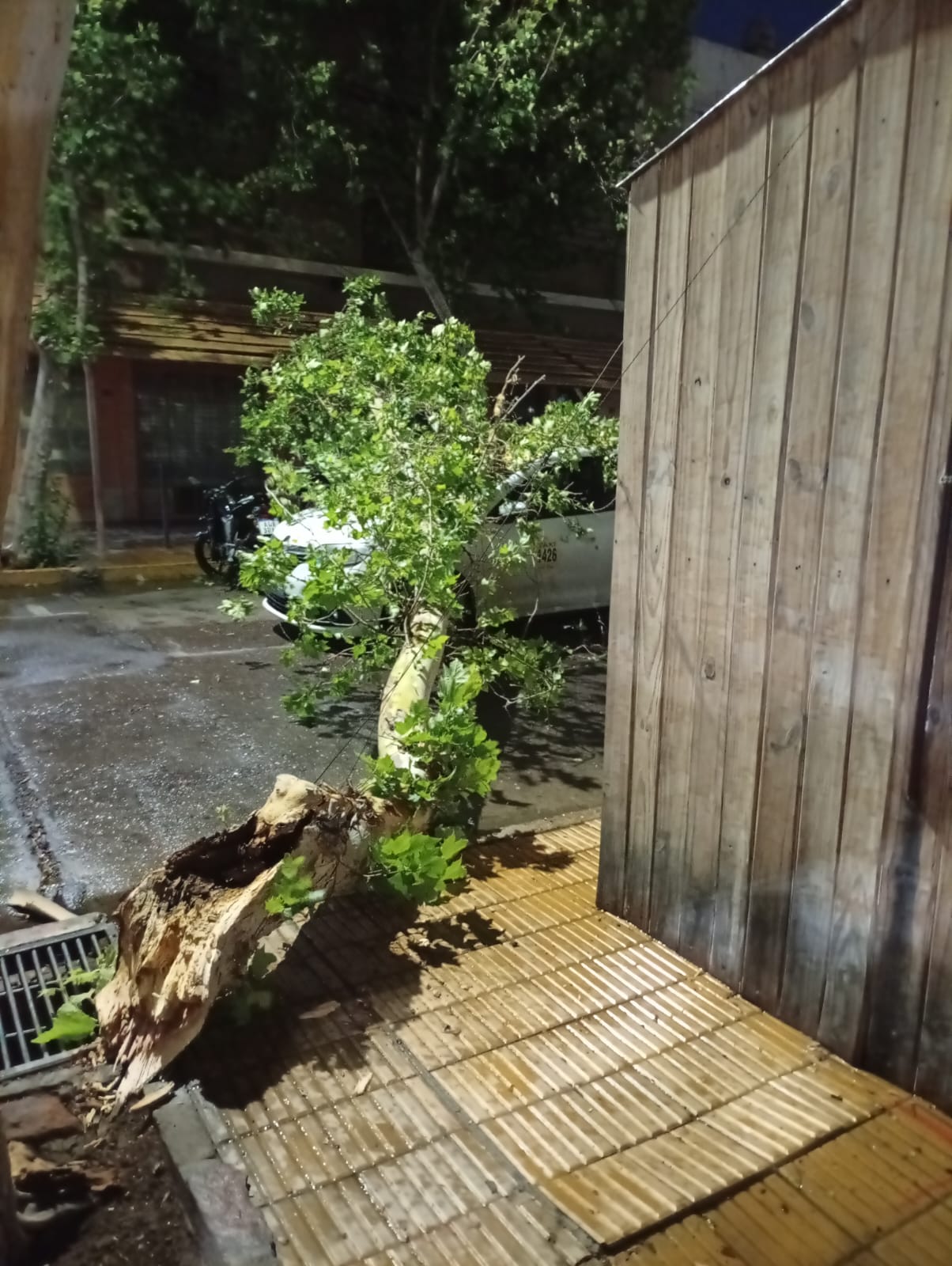 La caída se registró en calle Tucumán entre Ignacio de la Roza y Mitre. La Policía derivó el tránsito en ese tramo del microcentro de la Ciudad y alerta a conductores y transeúntes a permanecer en sus hogares por el peligro latente que representa el arbolado público.