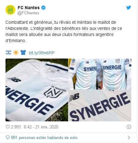 «El FC Nantes cambiará su camiseta amarilla y verde habitual por un partido y utilizará los colores de la Albiceleste. La edición será limitada (800 unidades) y todos los beneficios de las ventas de ésta camiseta se asignarán a los clubes formativos argentinos de Emiliano«, reza el mensaje con el que el conjunto francés vende la indumentaria desde su página web a un costo de 80 euros.