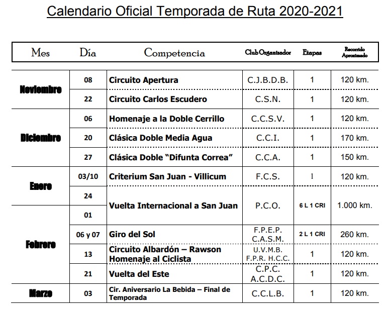 Desde la federación Ciclística Sanjuanina se dio a conocer el calendario de ruta.