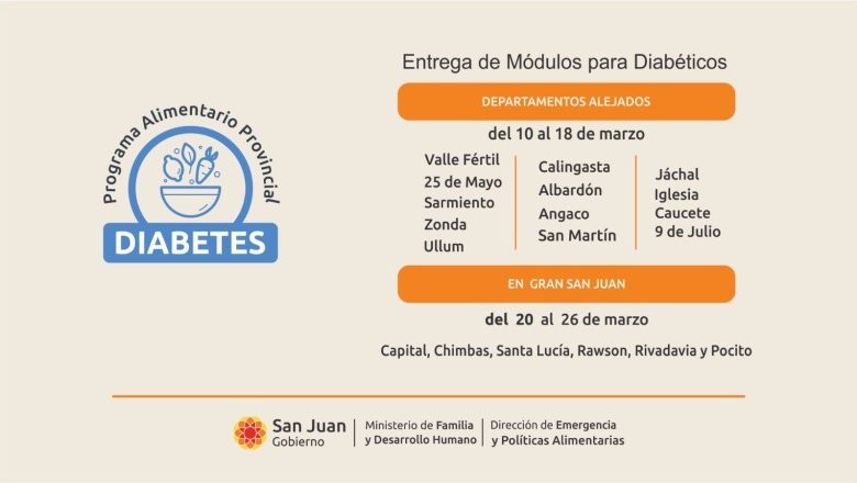 A partir del 20 al 26 de marzo de 2025, comenzará la distribución de los módulos alimentarios especialmente diseñados para personas con diabetes en el Gran San Juan. Los beneficiarios deberán presentarse en el depósito del Ministerio de Familia y Desarrollo Humano, ubicado en la calle Salta 1714 (norte), entre Sargento Cabral y Benavidez, en el horario de 8:00 a 12:30 horas.