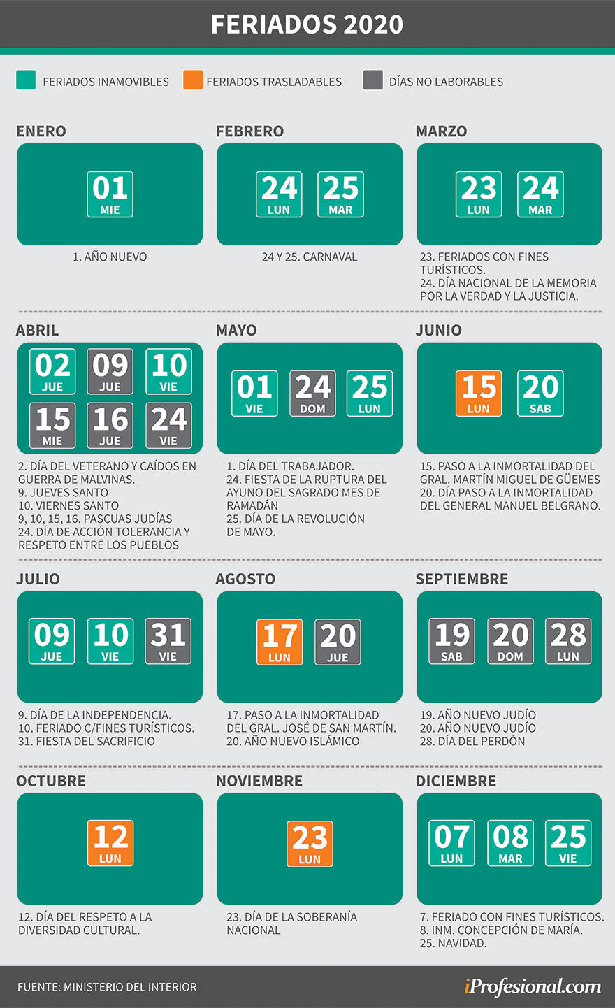 A estos deben sumarse de acuerdo al calendario de feriados nacionales 2020, los fines de semana largos que ya tuvo el año en el primer trimestre, para totalizar ocho fines de semana largos, de los cuales 4 son de más de tres jornadas o XL- en 2020.