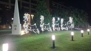 En la Plaza Seca se montó un cielo lumínico de 600 m², sostenido por una cuadrícula tensada especialmente, que integra 3200 tubos LED tipo “lluvia de meteoritos”, distribuidos en 400 kits, controlados mediante dos unidades inteligentes capaces de generar lluvia sincronizada, secuencias en abanico y encendidos progresivos. La estructura requirió 1350 metros de cables de acero y ya se convirtió en un punto altamente fotografiado por quienes recorren el predio. La intervención se complementa con figuras navideñas, un trineo iluminado, una Sagrada Familia LED y un árbol gigante de 7 metros, diseñado para potenciar la experiencia visual.