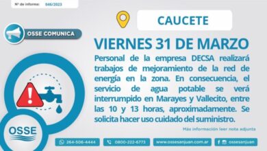 Por un corte de energía programado, el servicio de agua potable se verá afectado en Caucete