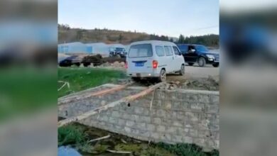 Se arriesgó a cruzar un río apoyando las ruedas de su vehículo sobre dos troncos