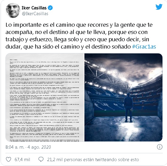 El arquero español Iker Casillas anunció este martes su retiro del fútbol, tras un año y dos meses sin jugar después de sufrir un ataque al corazón, cerrando a sus 39 años una carrera repleta de éxitos, siendo leyenda del Real Madrid y de la selección española, y con un broche final con títulos en el Porto.