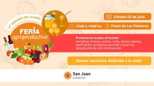 Este sábado 5 de julio, el Paseo de las Palmeras del Parque de Mayo reunirá a productores y artesanos sanjuaninos en una nueva propuesta de la tradicional Feria Agroproductiva, pero con una edición especial, dedicada al cierre de la 13° Semana de la Miel.