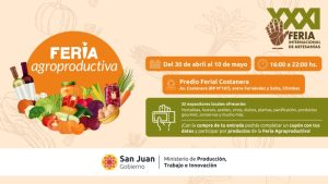 El evento se desarrollará del 30 de abril al 10 de mayo en el Predio Ferial Costanera en Chimbas, y participarán 32 emprendedores de la Feria Agroproductiva.