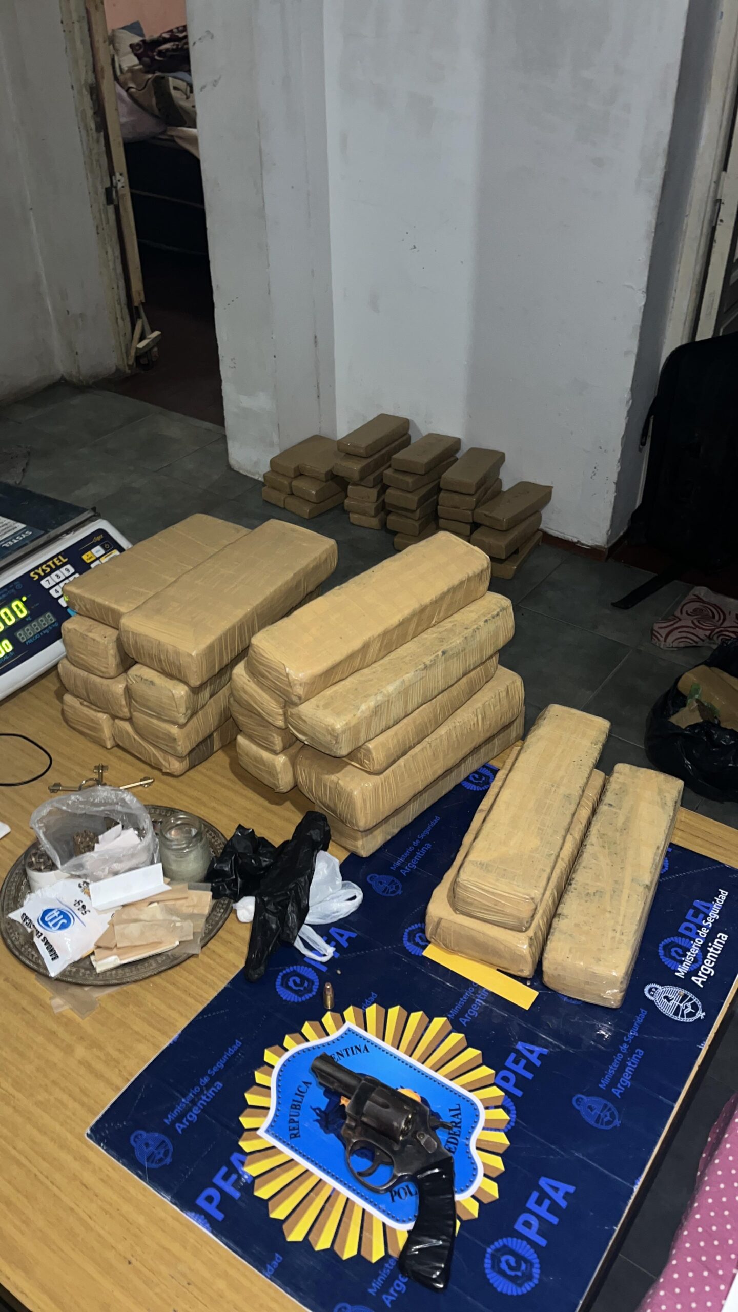 El procedimiento culminó con la detención de siete personas adultas con roles específicos en los eslabones de la cadena narco. También se secuestraron mas de 50 panes de marihuana compactada “Cannabis Sativa” los que se hallaban acondicionados para la venta además de 28 trozos de la misma sustancia vegetal fraccionados para la venta del tipo narcomenudeo.