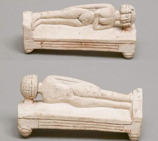 Un ejemplo notable es una figura femenina de piedra caliza de la dinastía XVIII (1550-1295 a. C.), exhibida en el Museo Metropolitano de Nueva York.