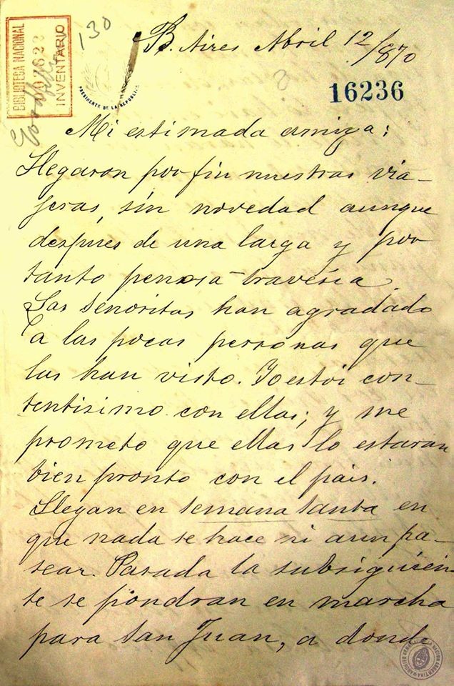 “Mi estimada amiga, llegaron por fin nuestras viajeras, sin novedad aunque después de una larga y, por tanto, penosa travesía. Las señoritas han agradado a las pocas personas que las han visto. Yo estoy contentísimo con ellas y me prometo que ellas lo estarán bien pronto con el país”, le escribió Domingo Faustino Sarmiento a Mary Mann, dándole cuenta del arribo en Semana Santa de las maestras norteamericanas, muchas de ellas con destino a la provincia de San Juan. La carta tiene fecha del 12 de abril de 1870. El original se encuentra en Archivo General de la Nación Argentina (Fondo Biblioteca Nacional. Legajo 766).
