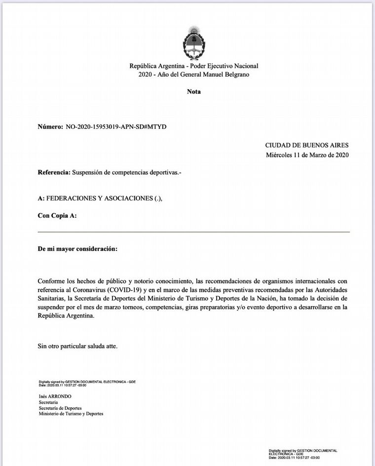 El Gobierno nacional ordenó la suspensión de todos los eventos y actividades deportivas que cuenten con la participación de deportistas de países con circulación activa del coronavirus.