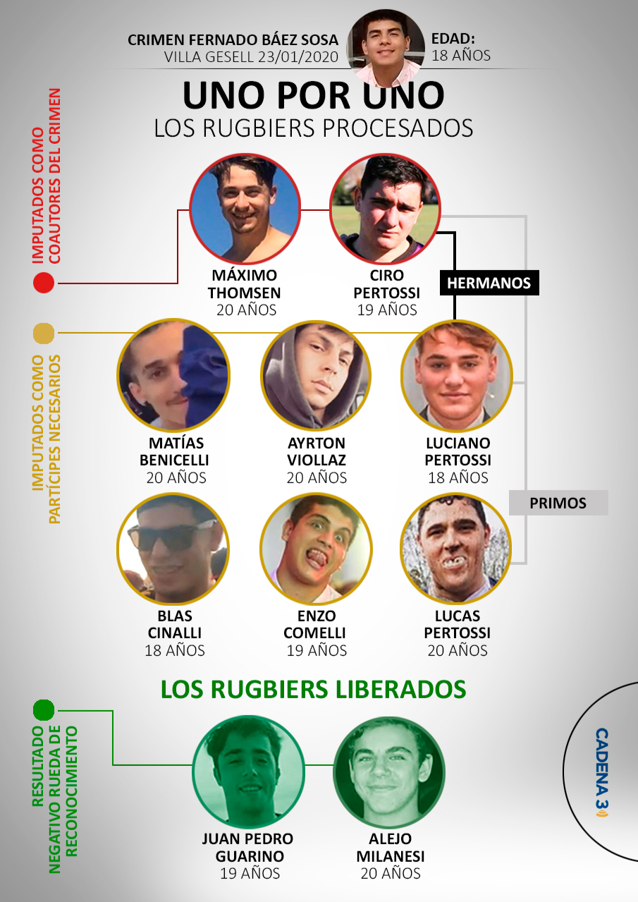 Alejo Milanesi, de 20 años, y Juan Pedro Guarino, de 19, dos de los rugbiers que se encontraban detenidos por el crimen de Fernando Báez Sosa, el joven asesinado en la puerta de un boliche de la localidad bonaerense de Villa Gesell, fueron liberados este lunes a la tarde tras la solicitud de la fiscal Verónica Zambroni, quien pidió la prisión preventiva para los otros ocho acusados.