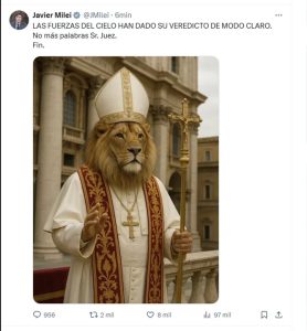 El presidente de Argentina, Javier Milei, celebró la elección del nuevo Papa León XIV con un mensaje cargado de simbolismo en su cuenta personal de la red social X. Junto a una imagen generada por inteligencia artificial que muestra a un león vestido con atuendos papales, Milei escribió: «Las fuerzas del cielo han dado su veredicto de modo claro. No más palabras Sr. Juez», en una publicación que rápidamente se volvió viral.