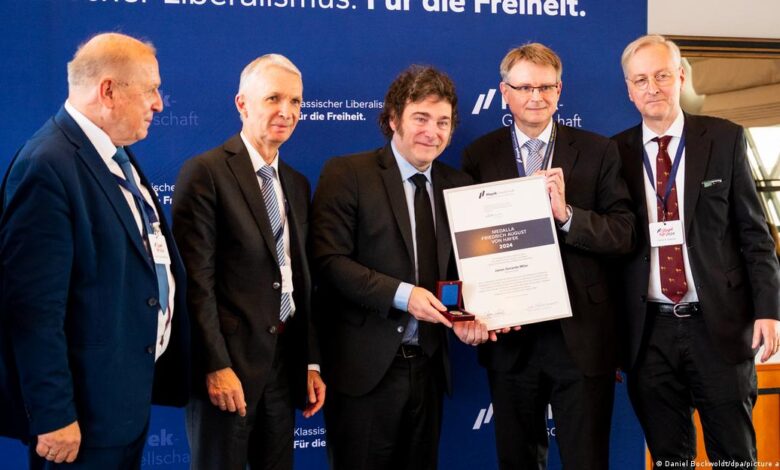 El presidente de Argentina, Javier Milei, recibió este sábado (22.06.2024) una medalla de la Fundación August von Hayek en el puerto alemán de Hamburgo. El galardón, otorgado por el think tank que lleva el nombre del austríaco pionero del neoliberalismo, se le otorgó por liderar un cambio de curso fundamental para «liberar de grilletes» a la población y devolverle «la esperanza».