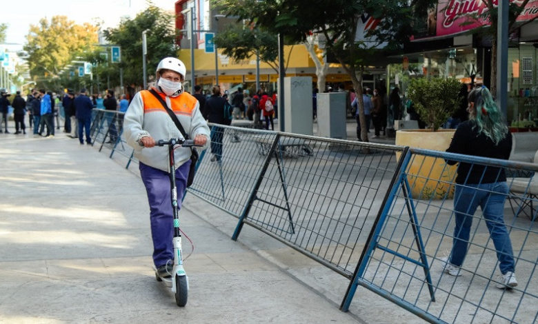 El equipo de Monitores Urbanos de la Capital colabora con el dispositivo de prevención y seguridad pública en el microcentro en el día de su reapertura. En una primera etapa los monopatines se utilizarán solo en la peatonal sanjuanina.