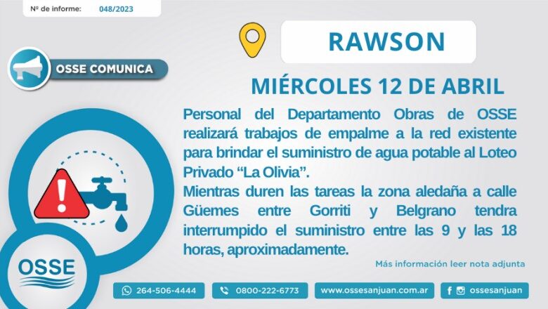 Personal del Departamento Obras de OSSE realizará trabajos de empalme a la red existente para incorporar al sistema y brindar suministro de agua potable al loteo privado “La Olivia”, ubicado sobre calle Güemes entre Gorriti y Belgrano, en el departamento Rawson.