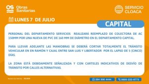 Personal del Departamento Servicios de Obras Sanitarias realizará el reemplazo de colectora de AC 150mm por una nueva de PVC de 160 mm de diámetro en el departamento Capital. Para llevar adelante las maniobras se deberá cortar totalmente el tránsito vehicular en en Ramón y Cajal entre San Luis y Libertador por el lapso de cinco días, desde este lunes 7 de julio.