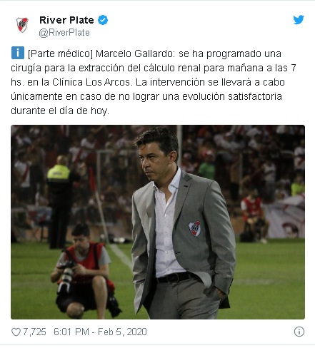 Marcelo Gallardo, entrenador de River, fue operado para la extracción de los cálculos renales, la causa de su internación desde el martes en la clínica Los Arcos. El DT ingresó al quirófano pasadas las 7.30 para una intervención que llevó un poco menos de dos horas. Desde su entorno confirmaron que está «muy bien» y se espera que el club emita un comunicado en las próximas horas.