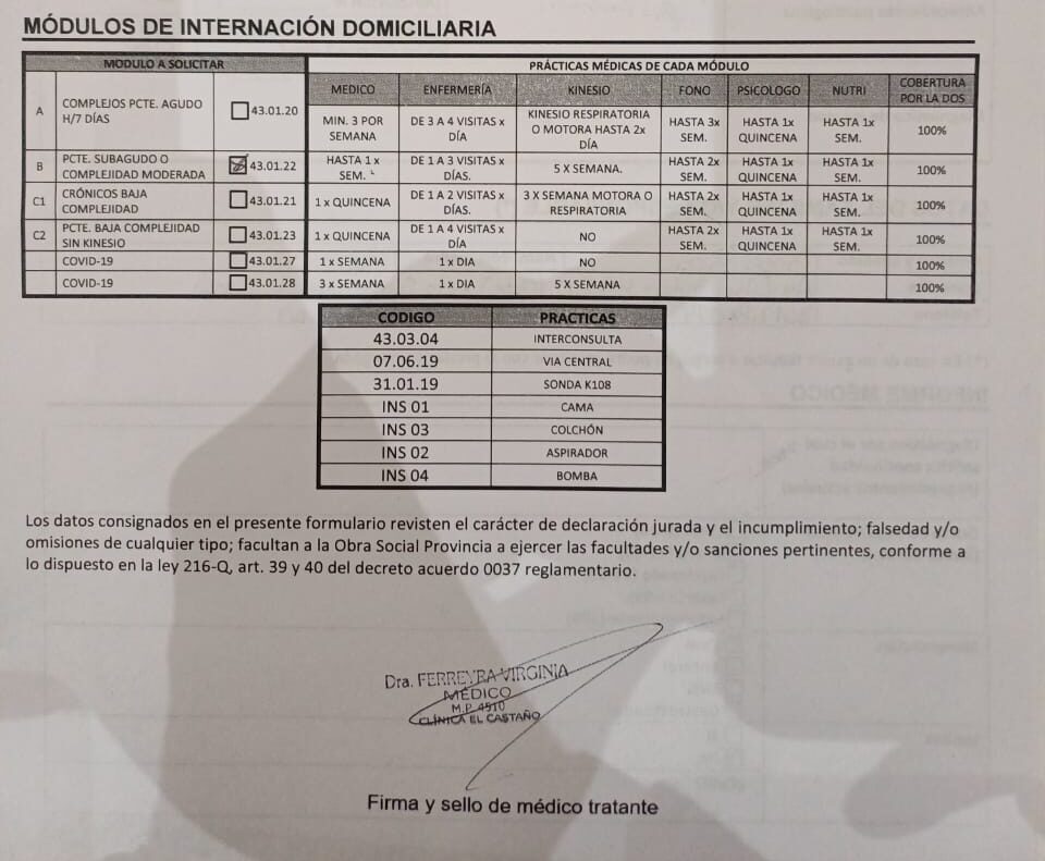 Las internaciones domiciliarias se clasifican en 3 códigos (20, 21 y 22) siendo el 20 el más costoso (1,2 millones de pesos) debido a su complejidad por la cantidad de prestaciones médicas que requiere: cinco sesiones de kinesiología por semana, un médico a la semana, dos veces al día servicio de enfermería, sesiones de psicología y nutricionista entre otras.