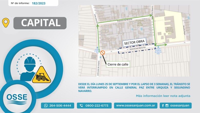 Obras Sanitarias Sociedad del Estado informa que este próximo lunes 25 de septiembre comienzan las tareas de restitución de calzada de calle General Paz, producto de una obra de reparación de colector.