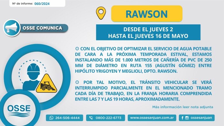 Con el objetivo de optimizar y reforzar el servicio de agua potable, de cara a la próxima temporada estival, OSSE se encuentra instalando, desde este jueves 2 de mayo, más de 1.000 metros de cañería de PVC de 250 mm de diámetro en Ruta 155 (Agustín Gómez) entre Hipólito Yrigoyen y Meglioli, Dpto. Rawson.
