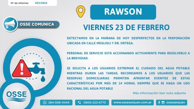 Obras Sanitarias detectó en la mañana de hoy, viernes 23 de febrero, desperfectos en la perforación ubicada en calle Meglioli y Dr. Ortega, que alimenta de agua potable a todas las zonas aledañas, por lo que inmediatamente se accionaron maniobras de reparación para restituir el servicio a la brevedad.