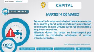 Personal de Obras Sanitarias, trabajará desde este martes 14 de marzo y por el lapso de 2 días en la restitución de colectora en calle Urquiza sur al 728 entre calles 9 de Julio y General Paz. Mientras duren las tareas se interrumpirá por completo la circulación, afectando el normal tránsito vehicular.