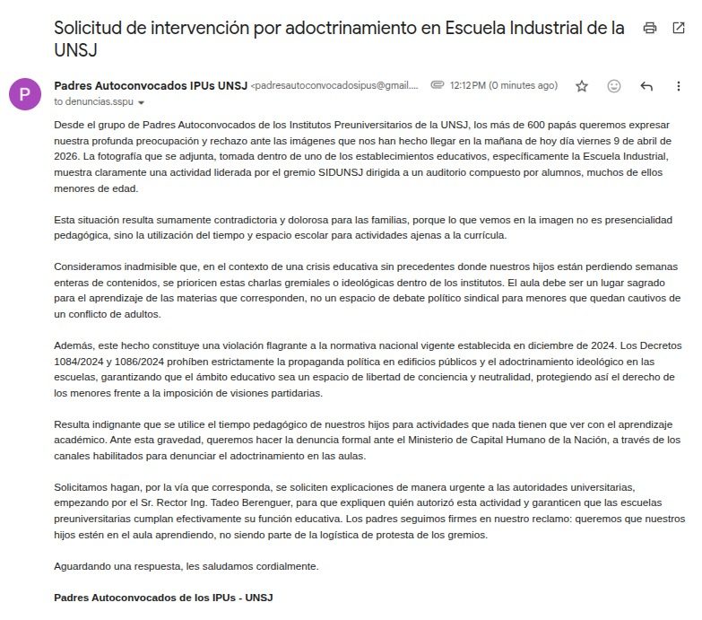 Por esta falta grave, padres de los alumnos denunciaron en al menos 10 llamadas telefónicas al 0800 del Ministerio de Capital Humano por el intento de adoctrinamiento de sus hijos ya que las clases previstas para ese día no fueron dictadas. Contrariamente el sindicato montó un gazebo desde donde hizo militancia e hizo parte de una jornada de ideologización a alumnos de ese Instituto preuniversitario.